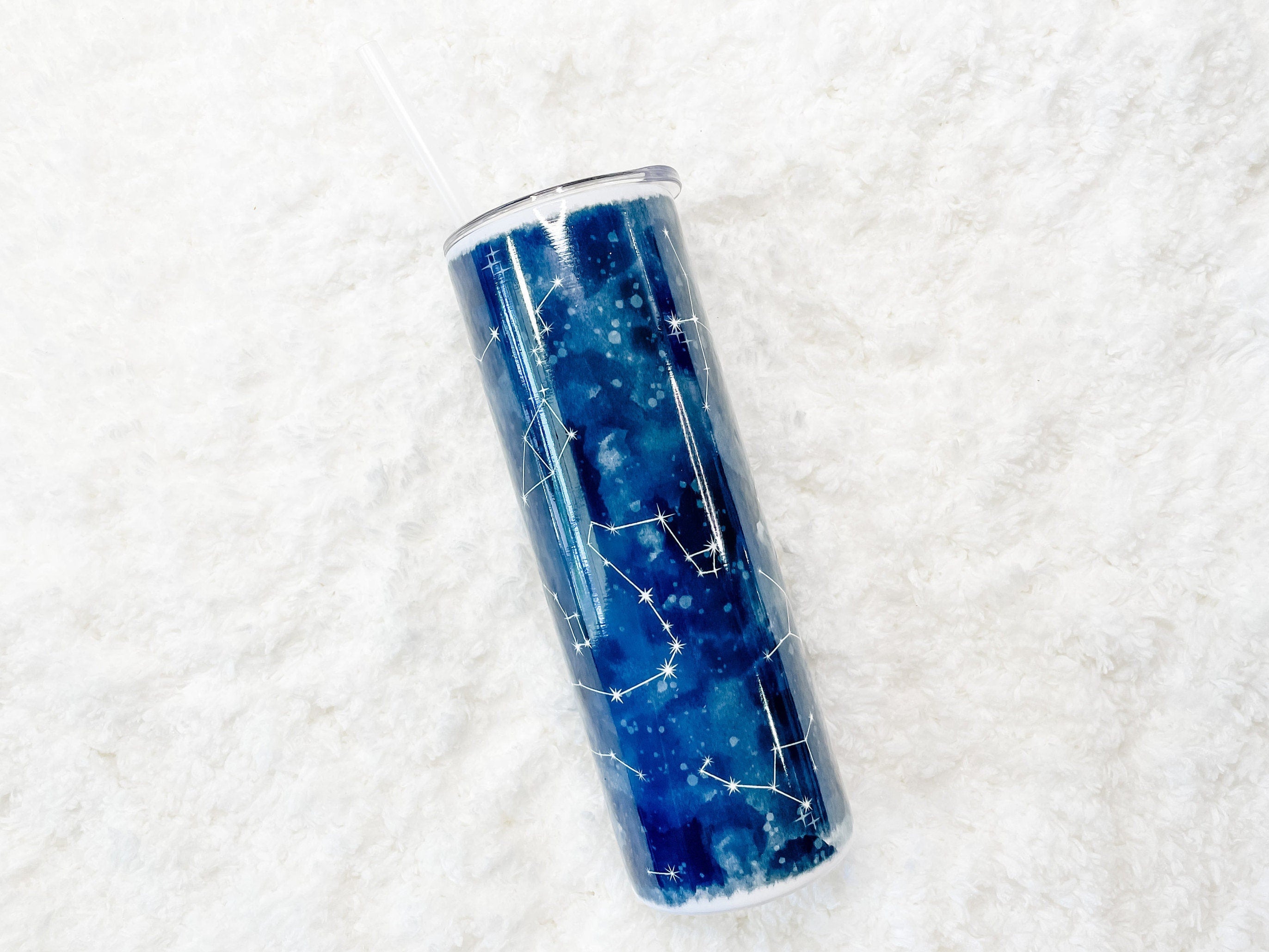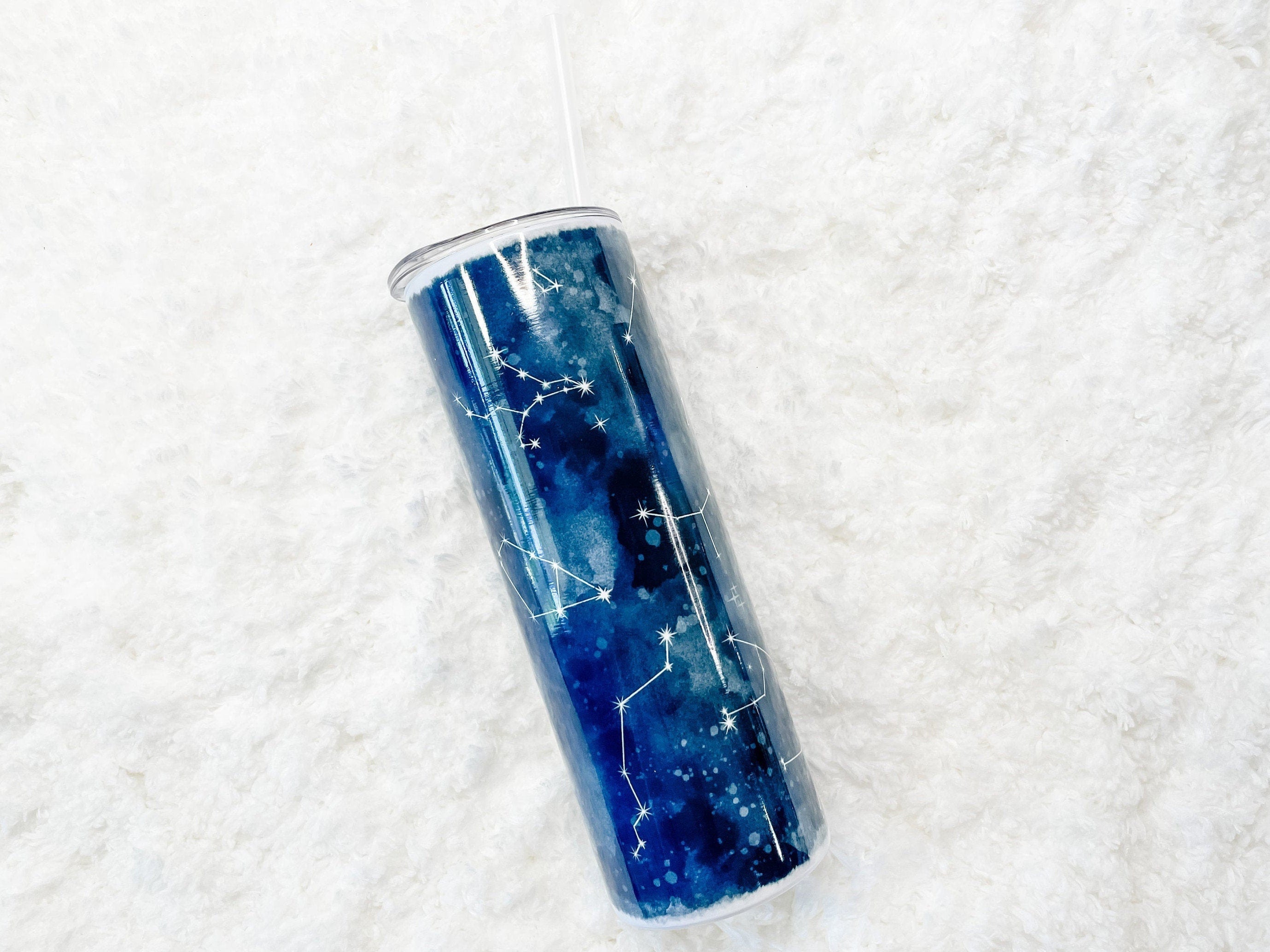 This vibrantTumbler features hand-drawn watercolor style sky backdrop and star constellations. This is original artwork created by the shop owner. The pattern features a deep blue watercolor background with star detailing. While this is drawn from constellation formations it has been spaced to fit onto the tumbler and is not an accurate depiction of the night sky.