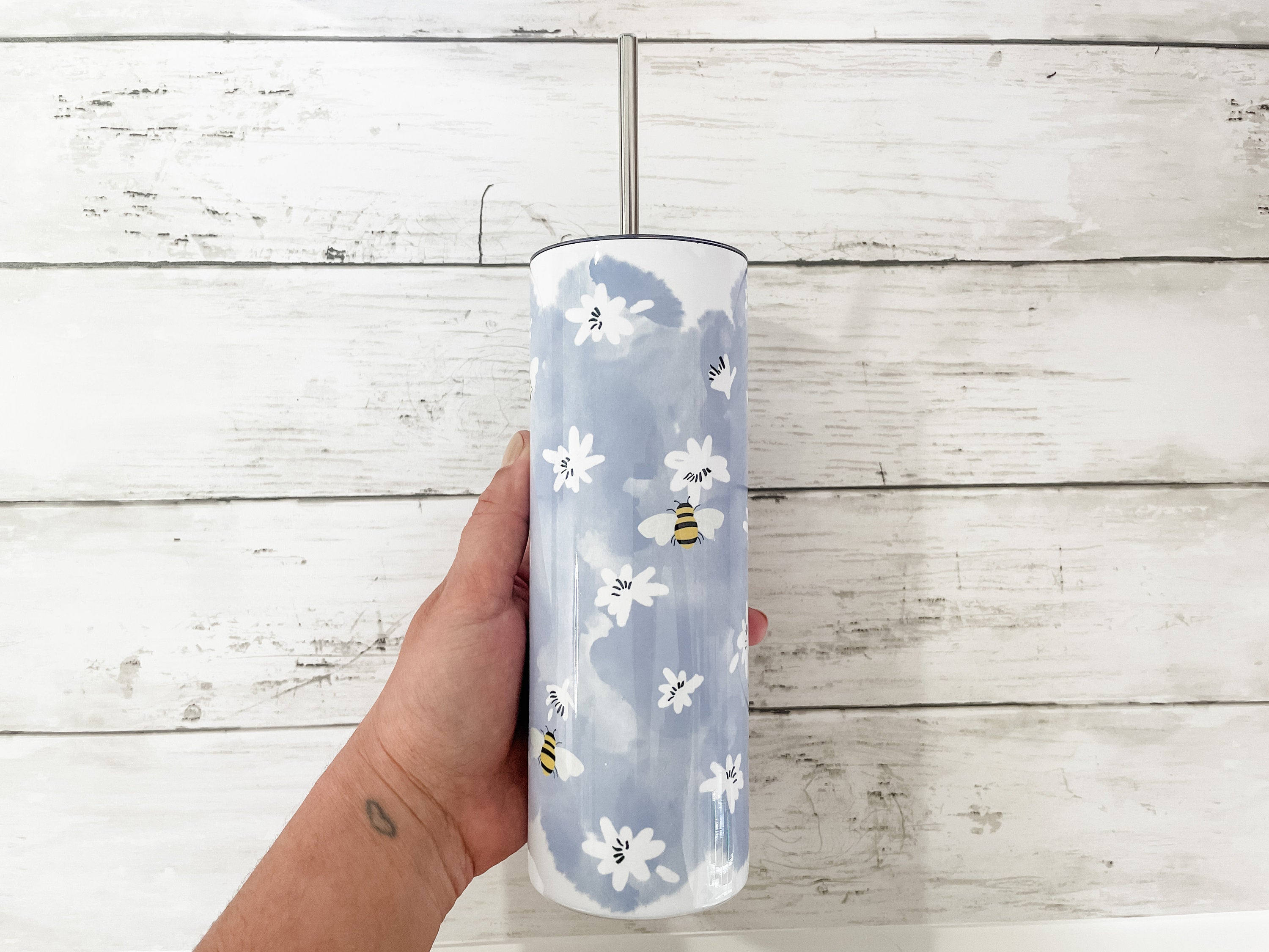 This sweet Tumbler features a hand-drawn watercolor style Daisy and Bumble Bee pattern. This is original artwork created by the shop owner. The pattern features a blue watercolor background with bumble bees and white daisies or flowers as a full-wrap design.