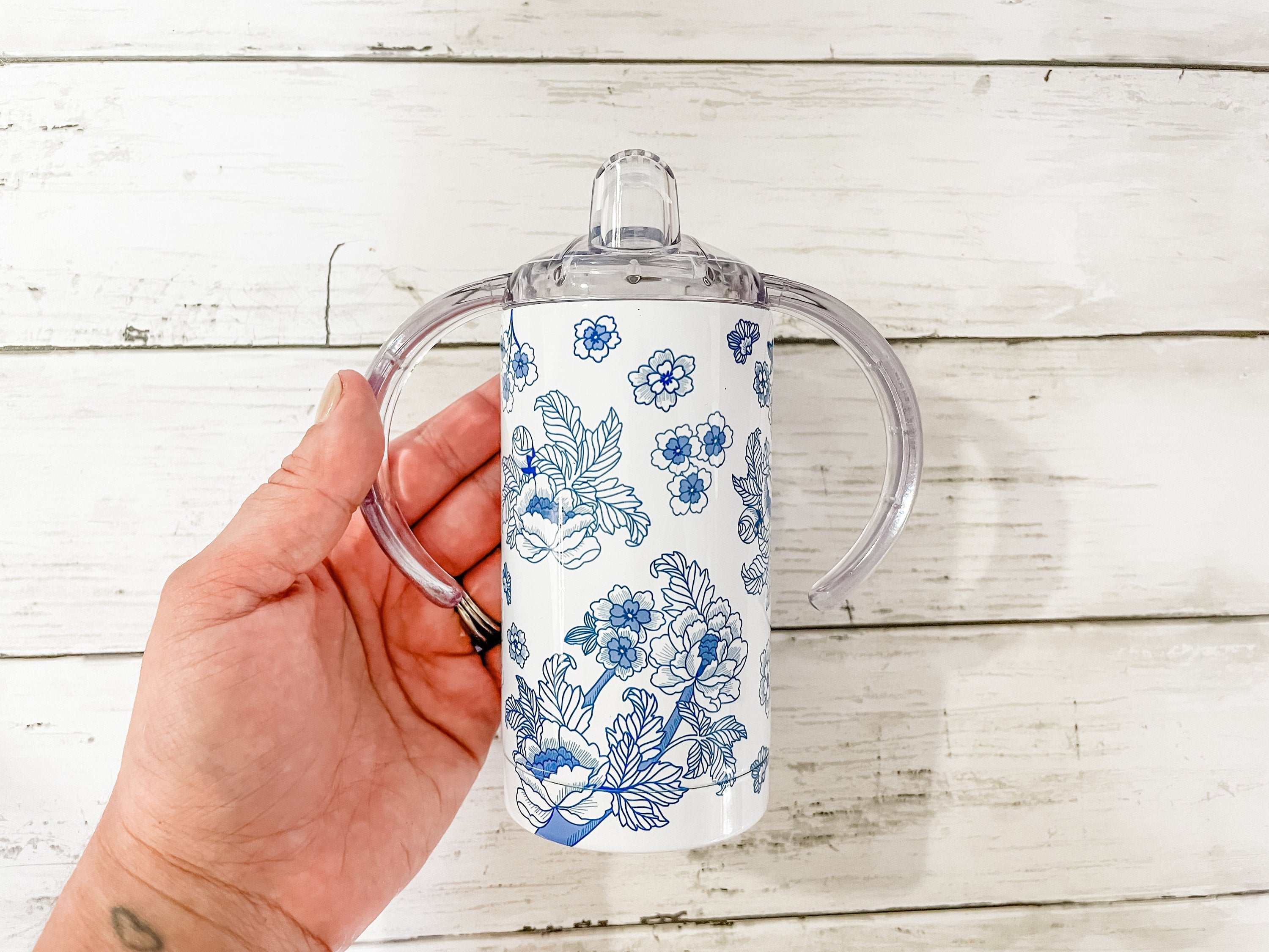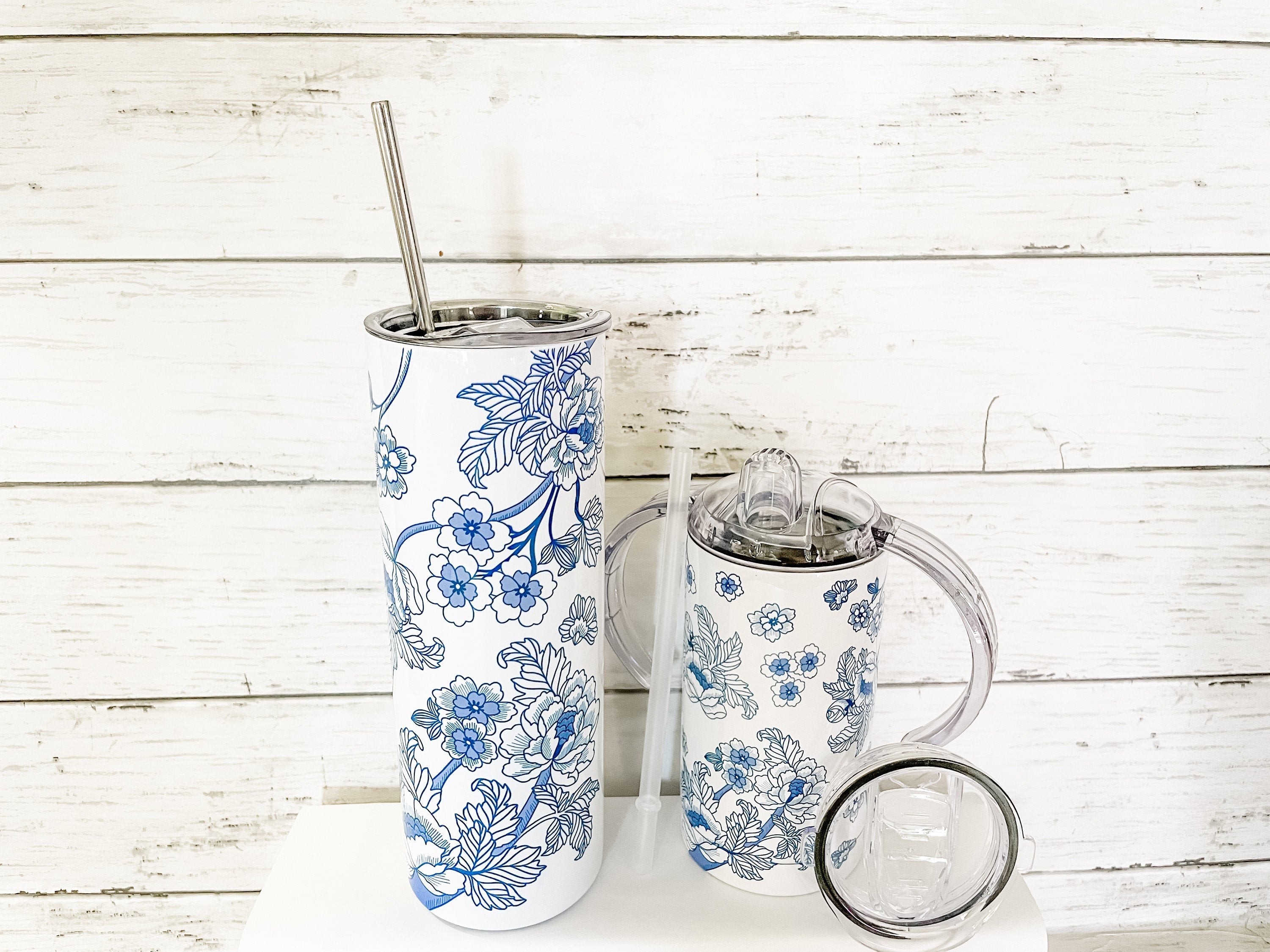 Matching Mama and Baby or Mama and Mini Tumbler set! This hand-drawn Chinoiserie-style blue and white art is original artwork created by the shop owner. The pattern features a leaf and flower branch pattern as a full-wrap design.