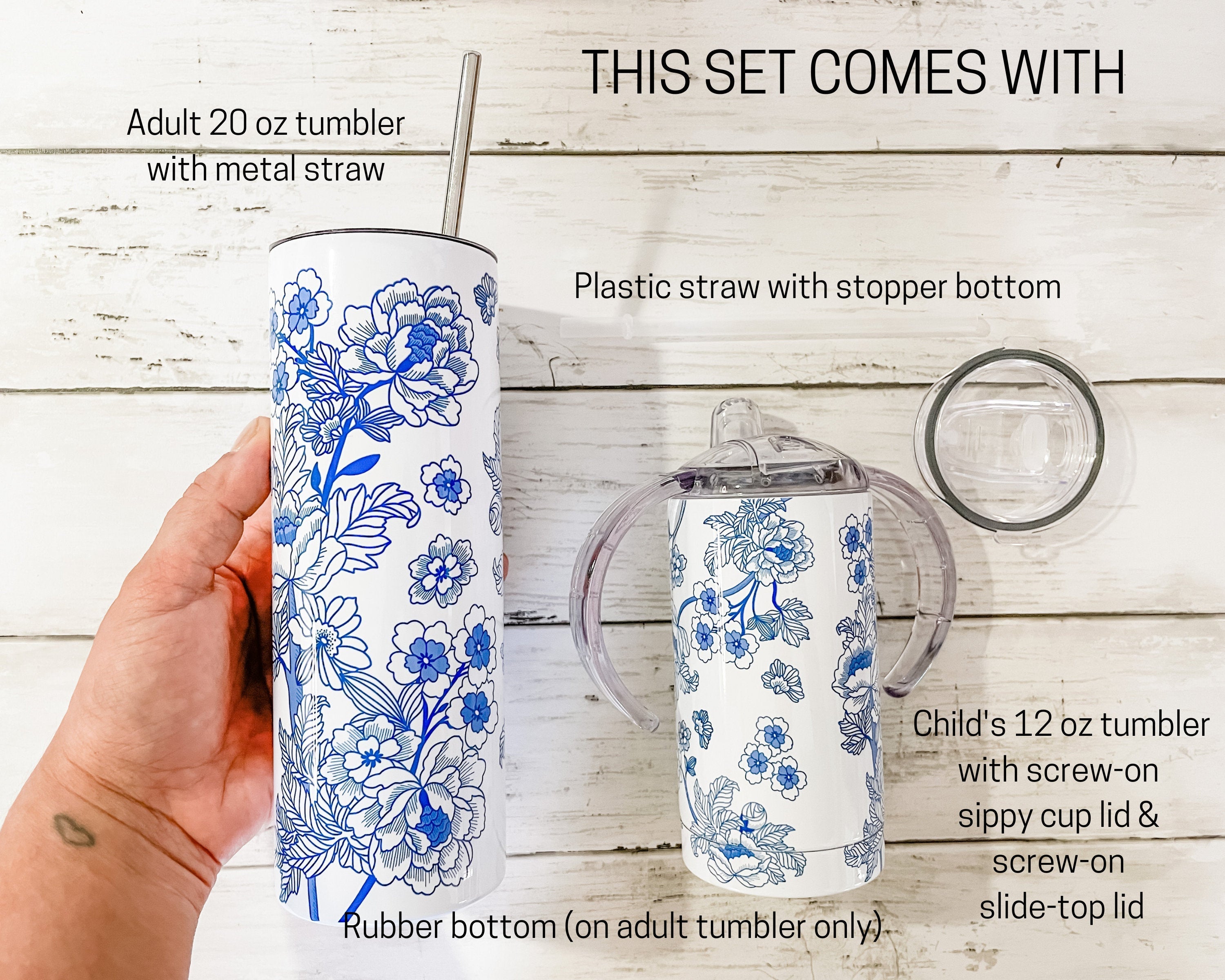 DETAILS: - The large tumbler is 20 oz, double insulated with a plastic slide top lid and comes with your choice of a silver metal straw or hard plastic straw with stopper end (to keep the straw from coming out of the slider top). - The large tumbler comes with a rubber bottom. - The small tumbler is 12 oz, double insulated and comes with both a slow-flow sippy cup lid and a slide top lid with a plastic straw with stopper end (to stop the straw from being pulled out from the top). This grows with the child and allows for use for many years! - The child's tumber lids are both screw-on. The adult tumbler lid is press-on. - Printed with sublimation printing for a long-lasting professional finish. - No epoxy used on these designs