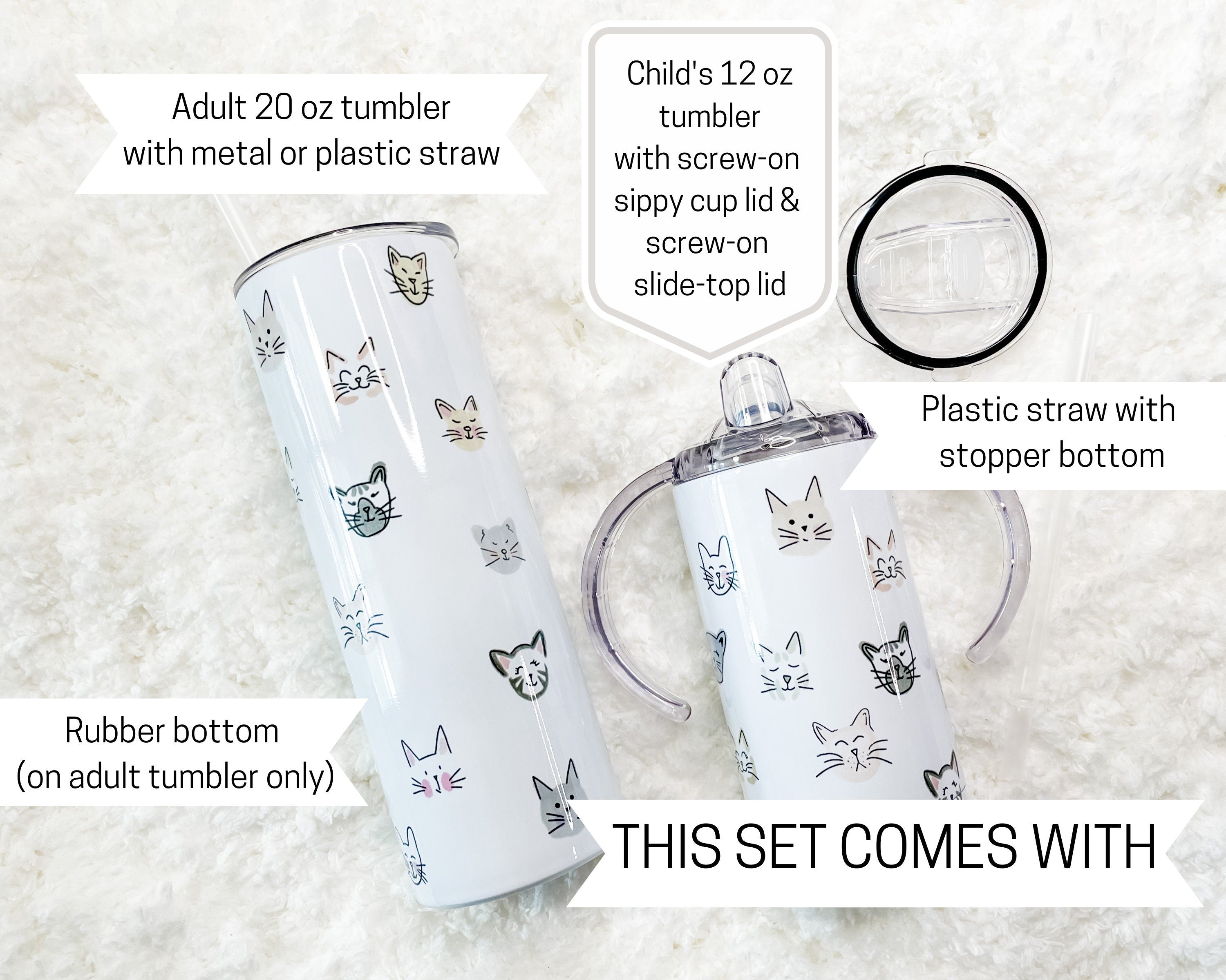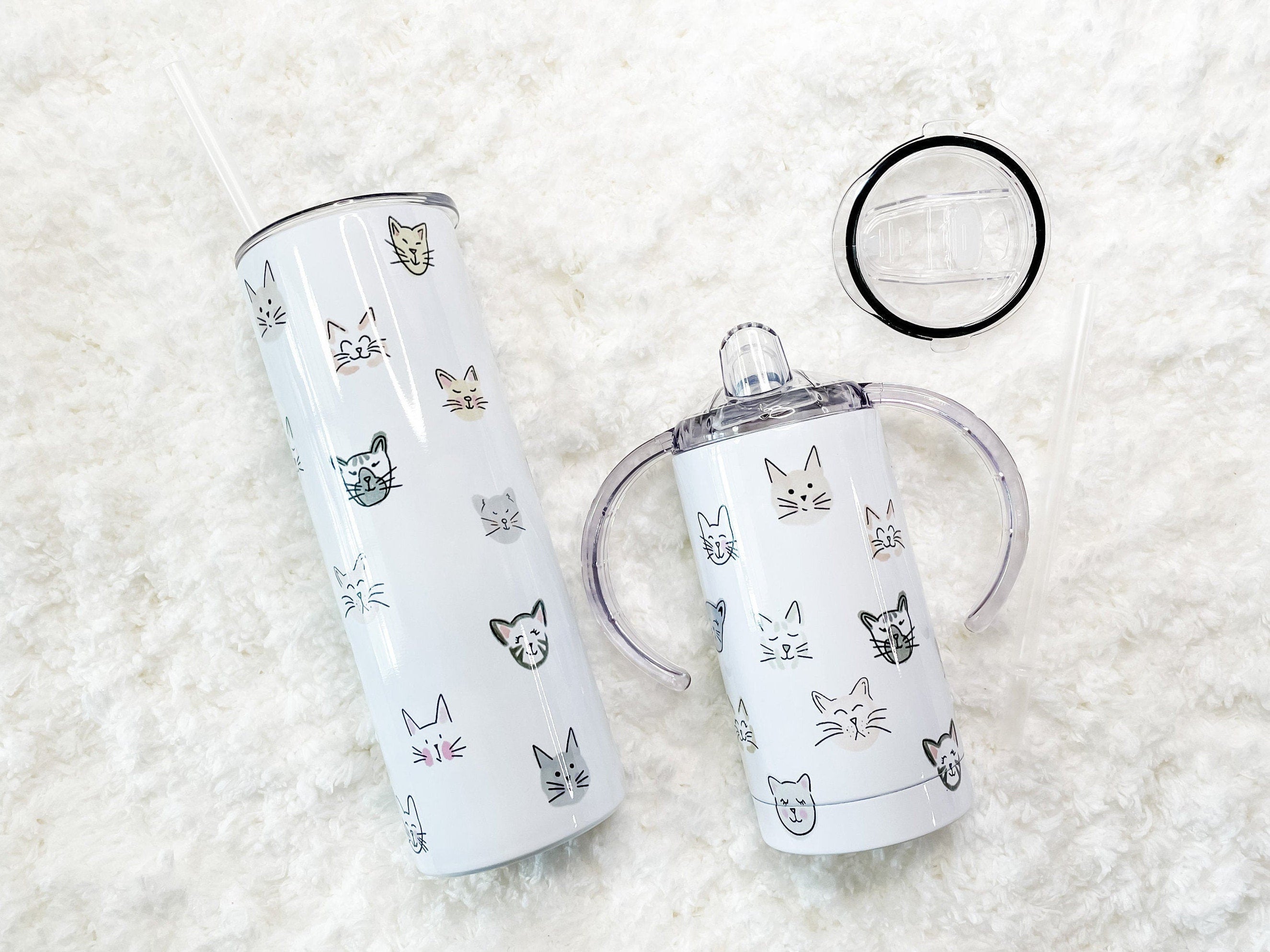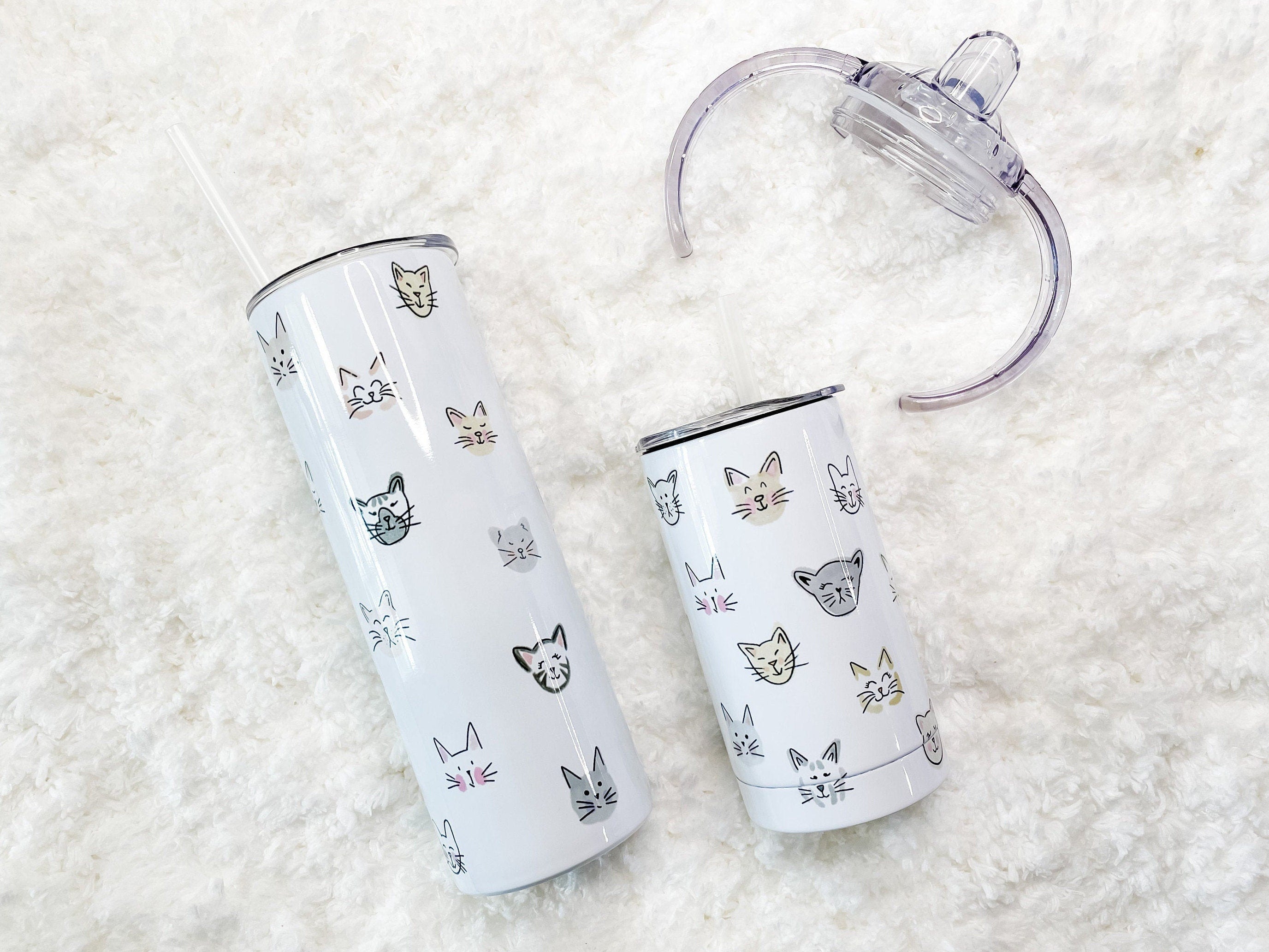 Matching Mama and Baby or Mama and Mini Tumbler set! This Tumbler set features several hand-drawn Cat Face illustrations. The pattern creates a full-wrap, no-seam design.