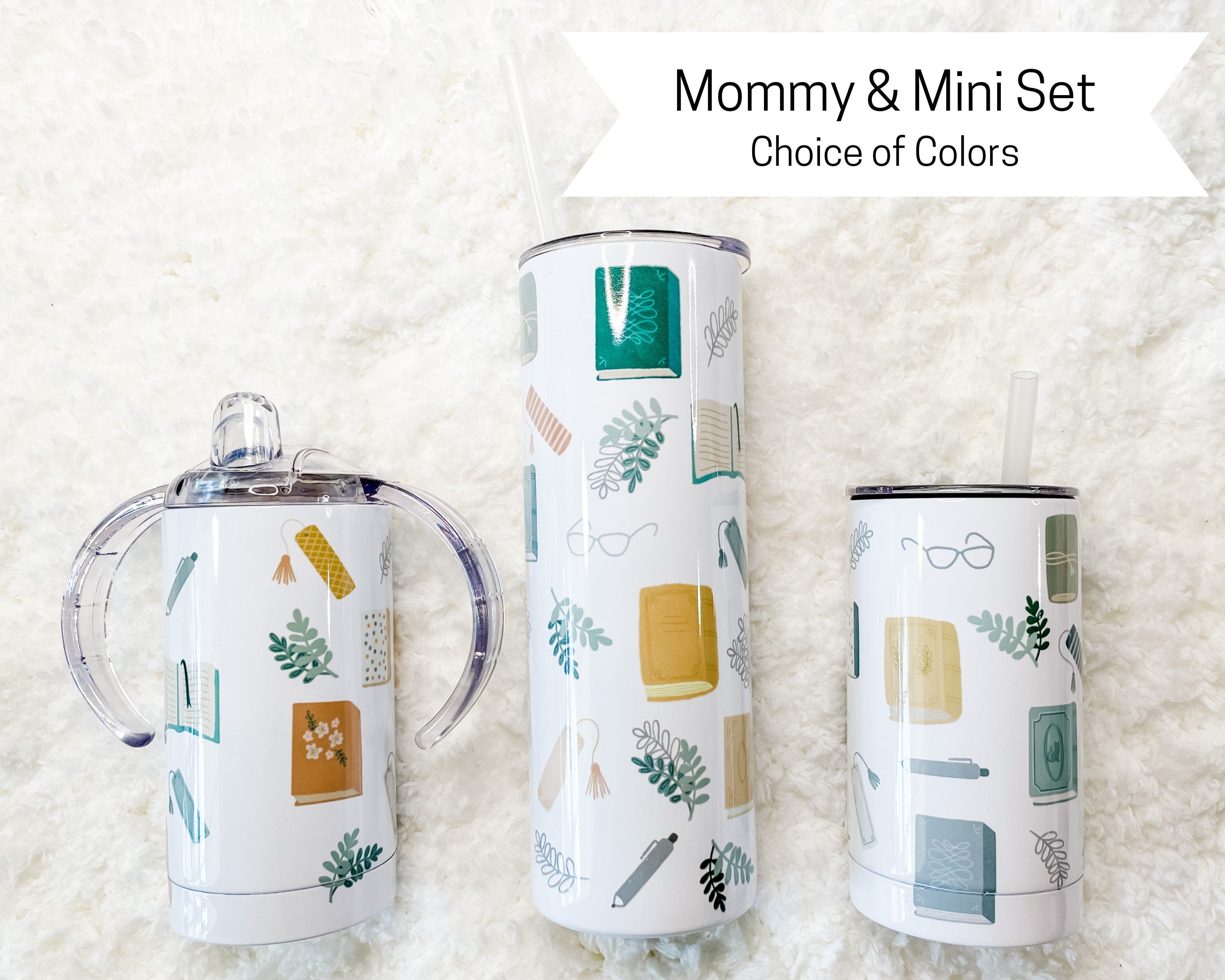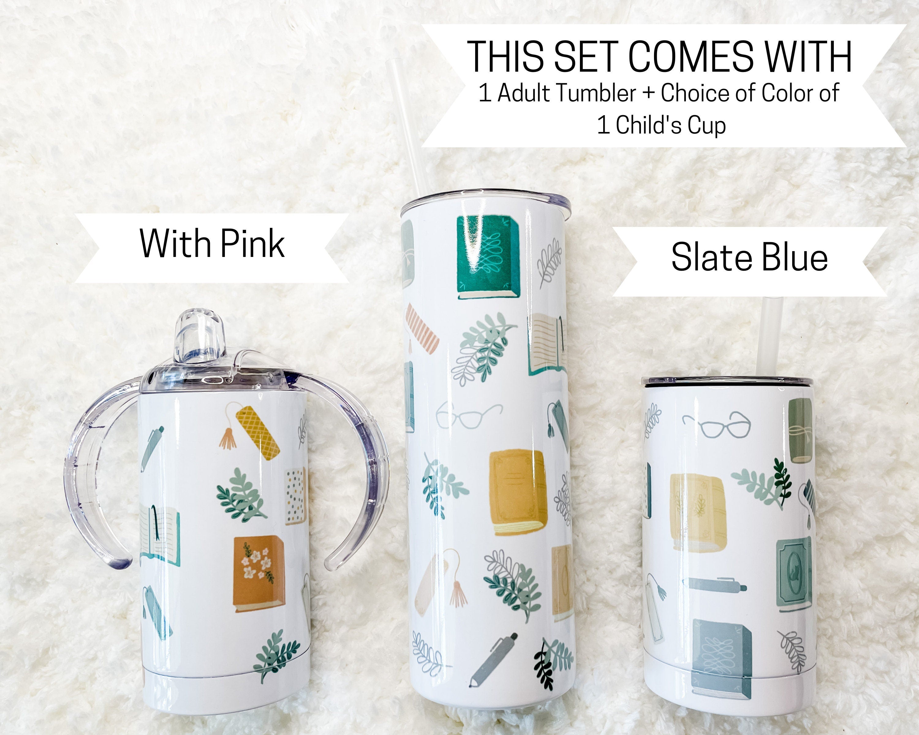 Matching Mama and Baby or Mama and Mini Tumbler set! This Tumbler set features an Adult tumbler in the Vintage Book print + your choice of 1 child's cup either with Pink or Slate Blue kids cup. The pattern creates a full-wrap no-seam design. Additional cups may be added on for other children or adults from the listings linked below.