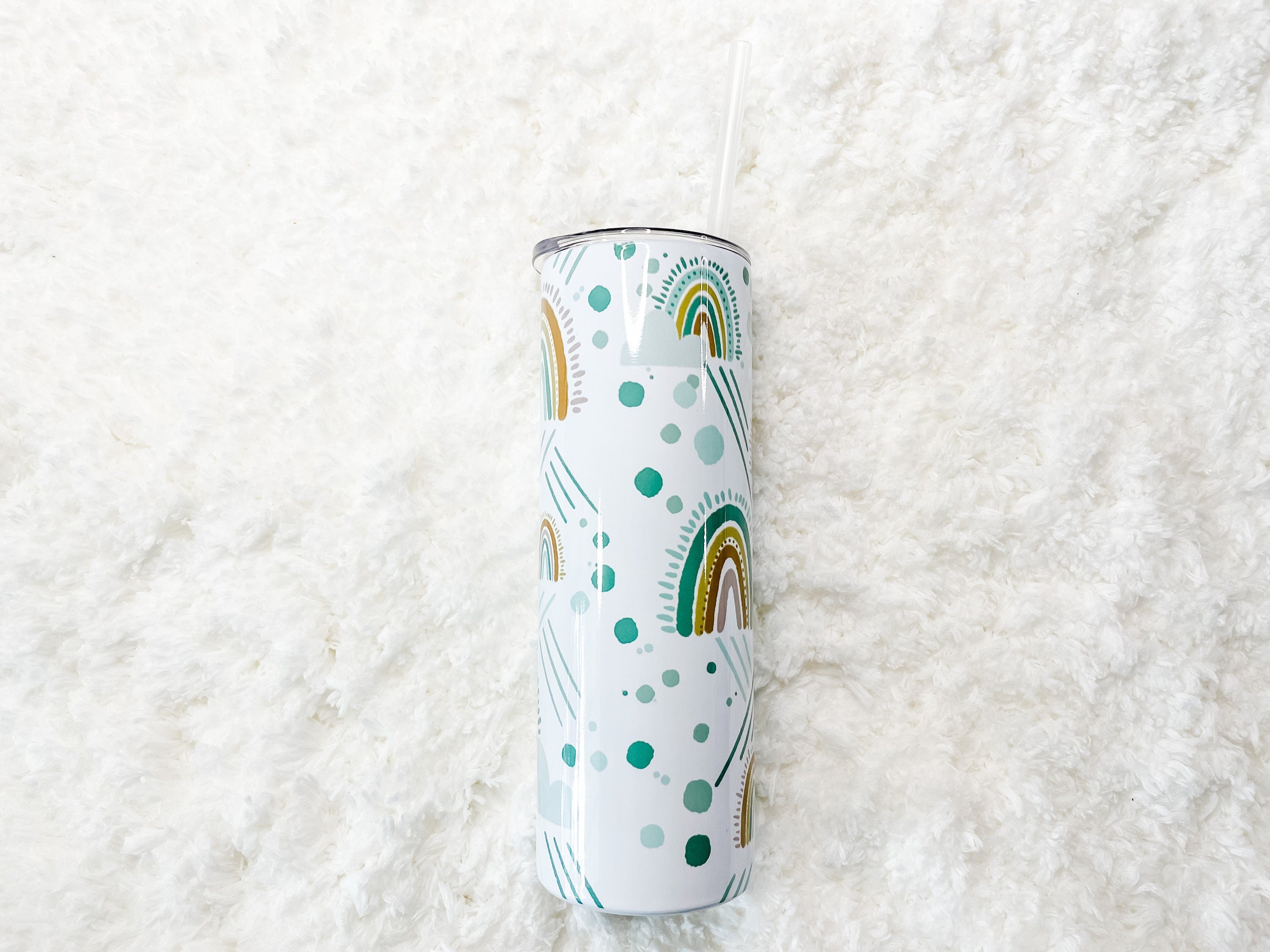 This sweet Tumbler features hand-drawn Rainbow illustrations with dots and stripes. This is original artwork created by the shop owner. The pattern features a white background with illustrated rainbows as a full-wrap no seam design.