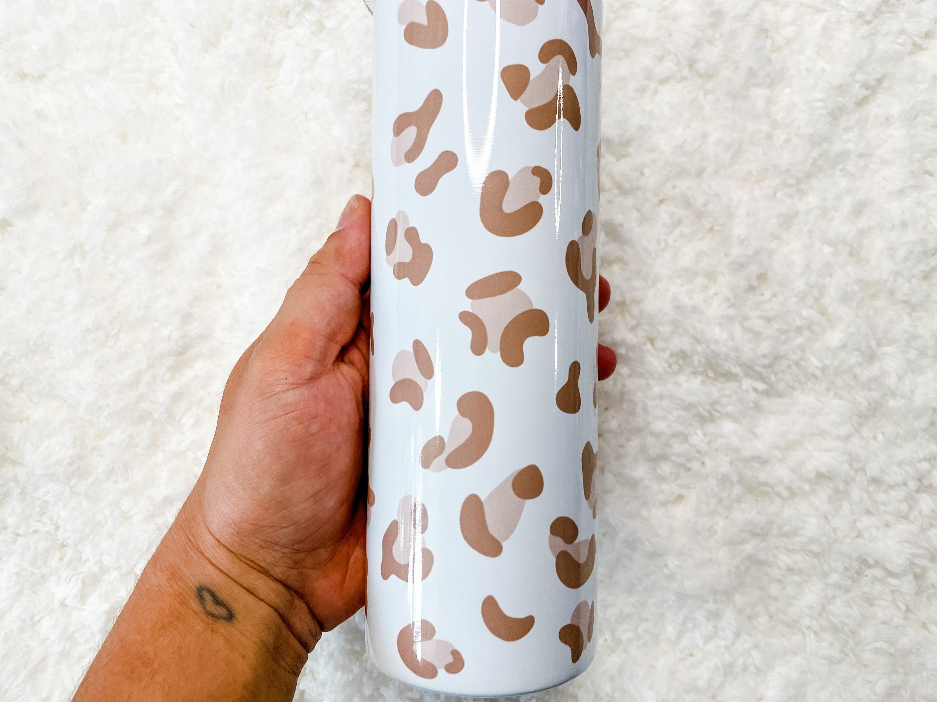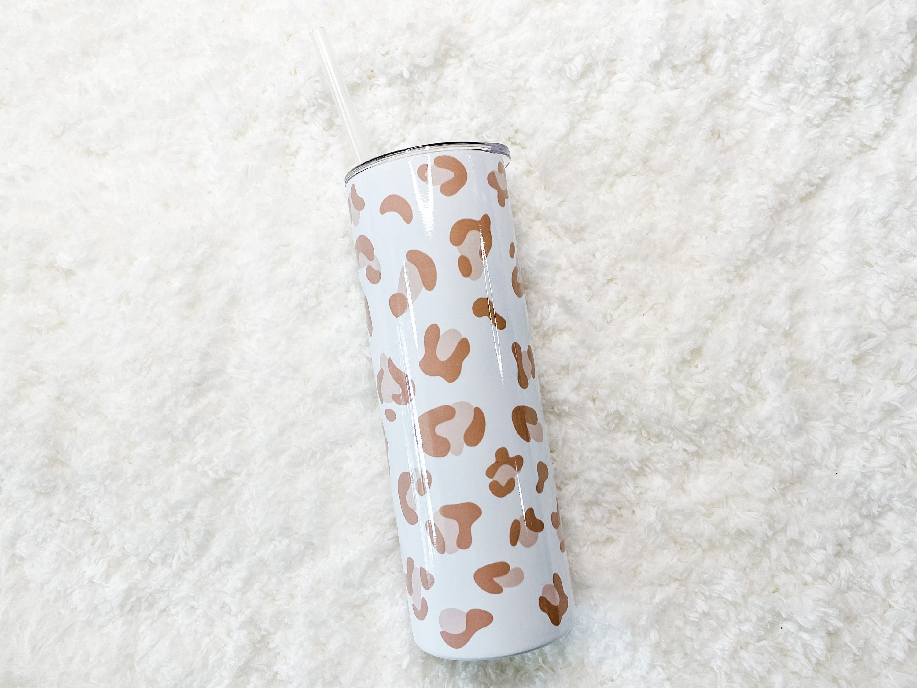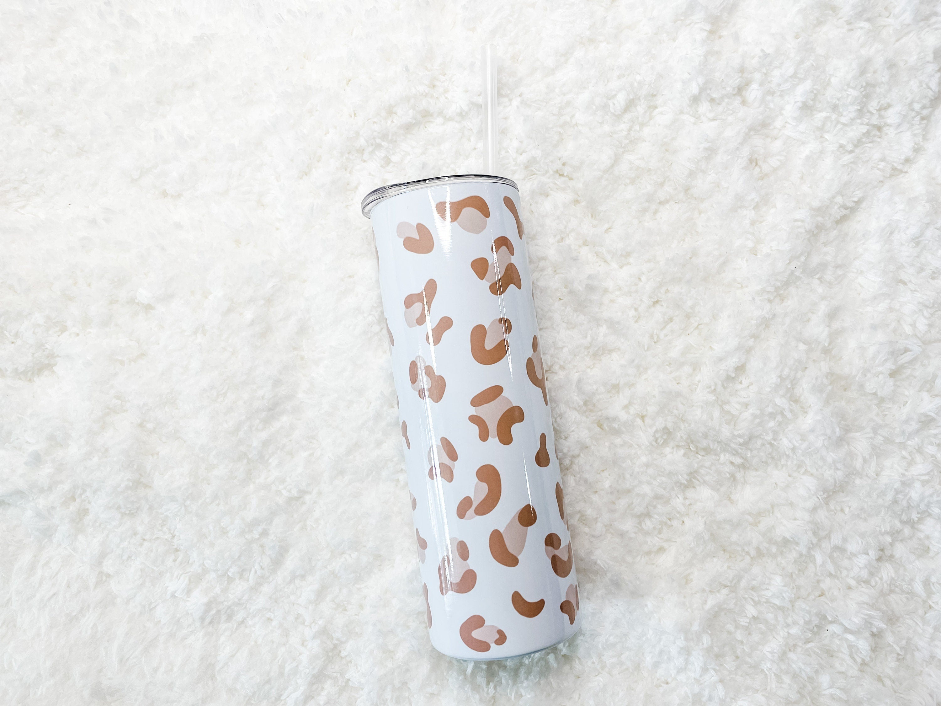 This pretty Tumbler features hand-drawn dusty pink Leopard Print spots. This is original artwork created by the shop owner. The pattern features a white background with the Leopard Print as a full-wrap no seam design.